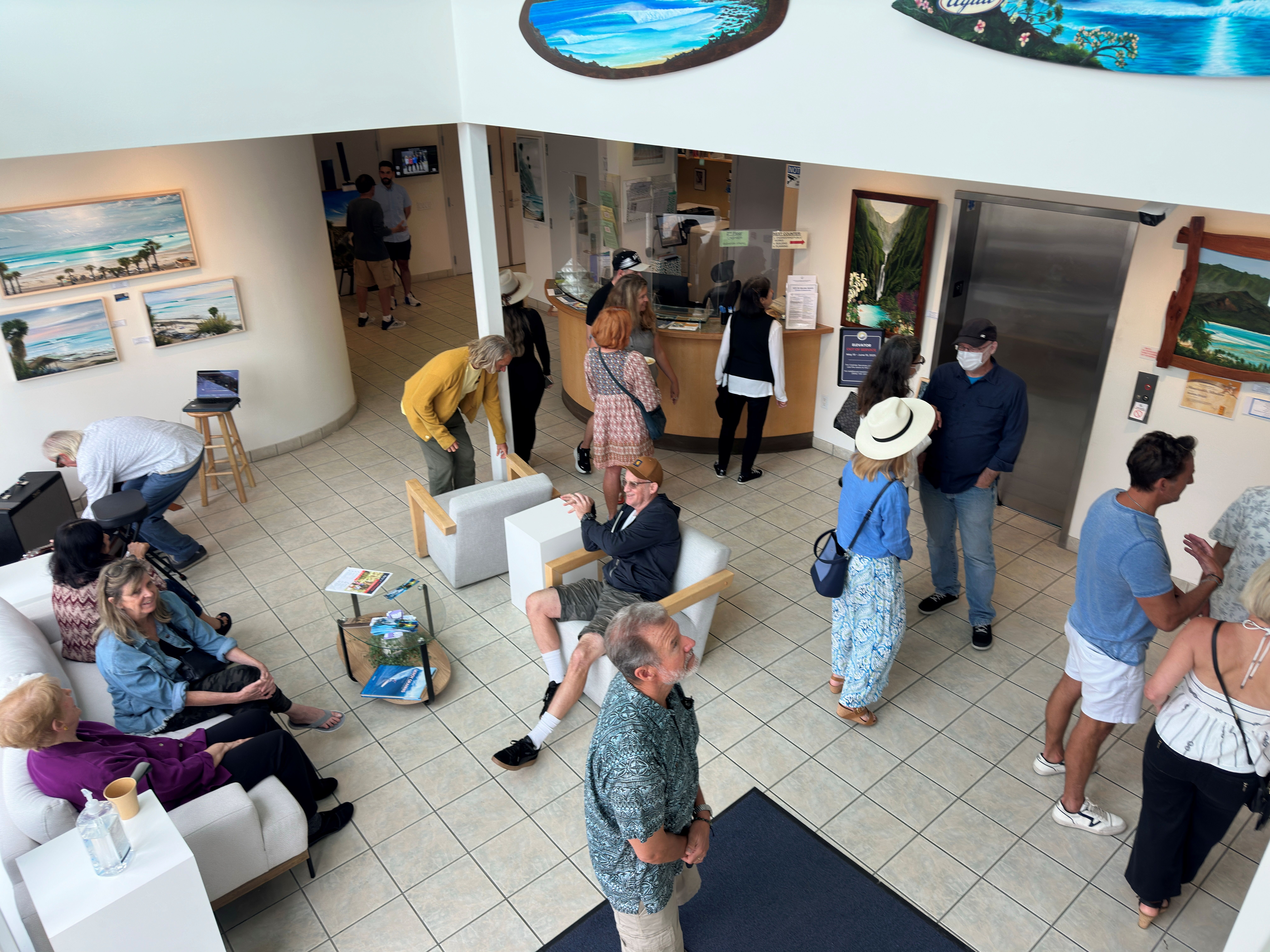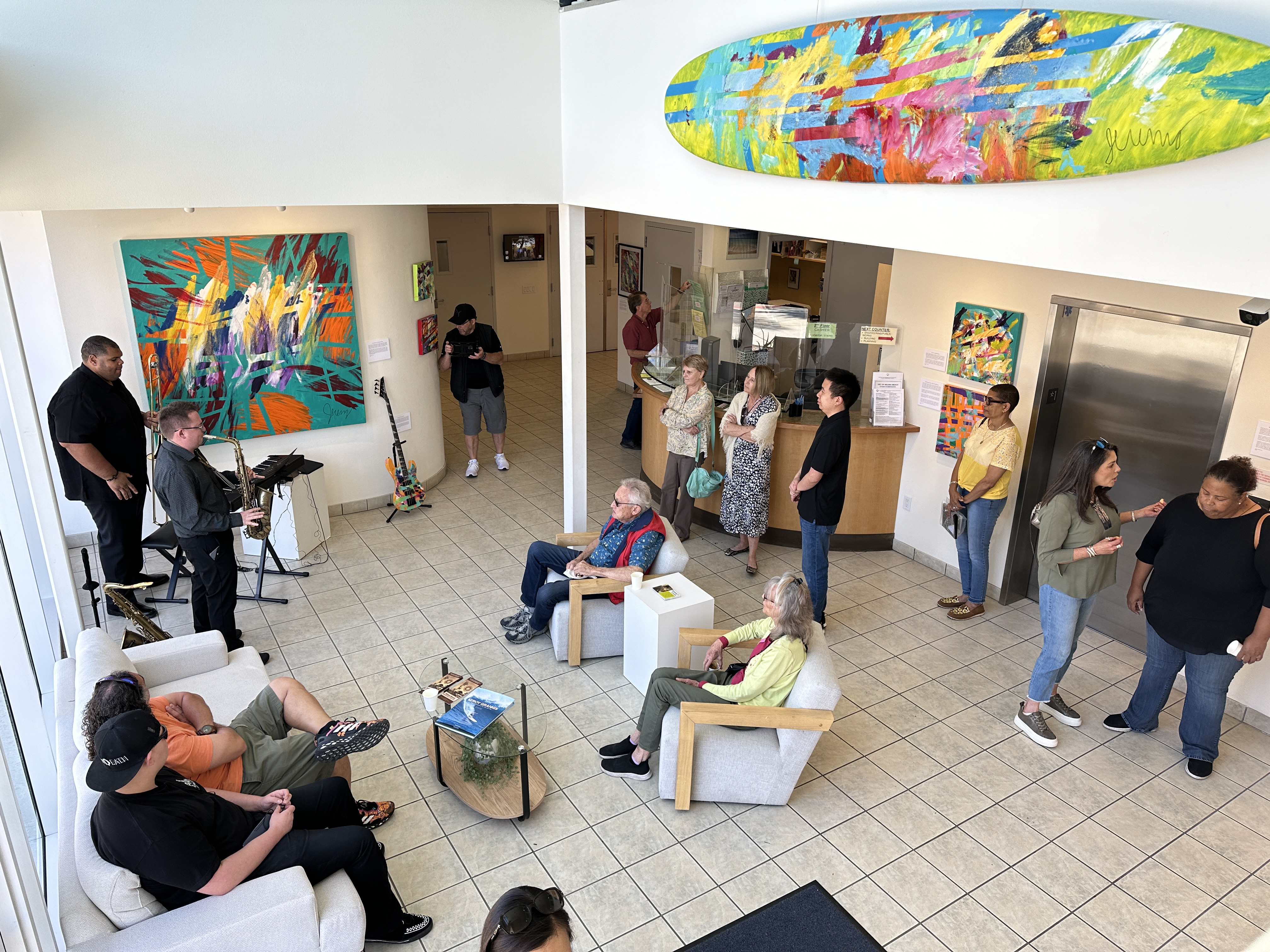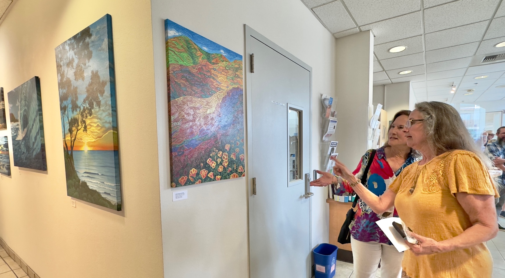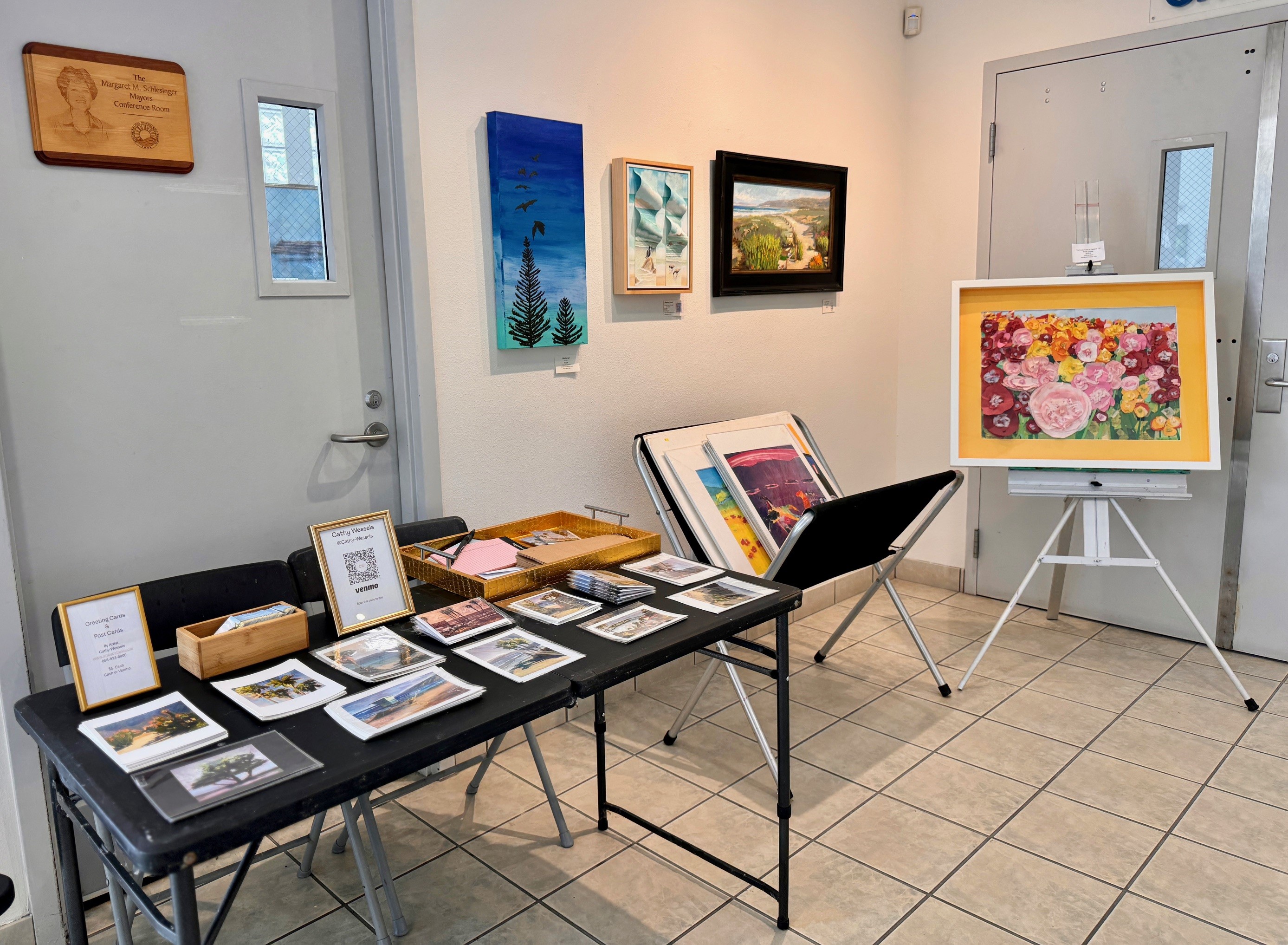 The Solana Beach City Hall Gallery is an unique space dedicated to supporting local artists by providing a complimentary, high-traffic venue to display their work. The program hosts six exhibitions each year, each lasting two months, featuring a rotating display of artistic talent through solo, group, or curated exhibits. The gallery has showcased a variety of art forms, such as watercolors, photographs, recycled metal sculptures, children’s art, and painted surfboards.